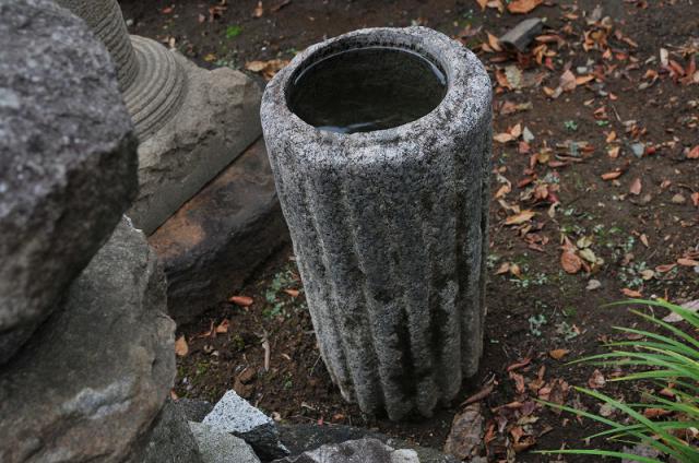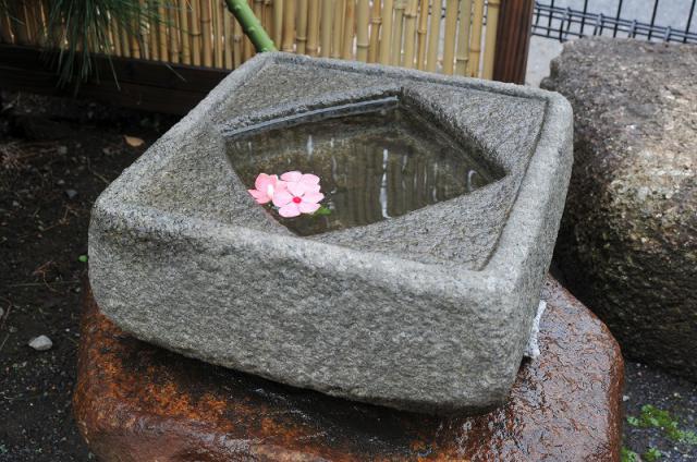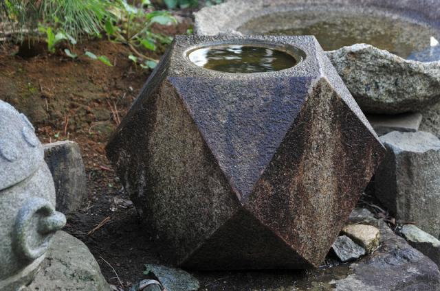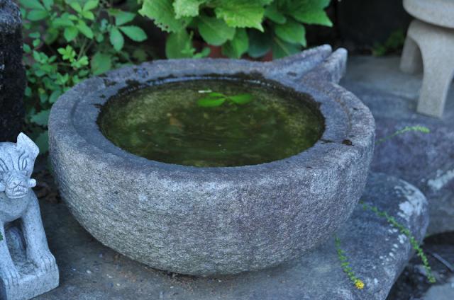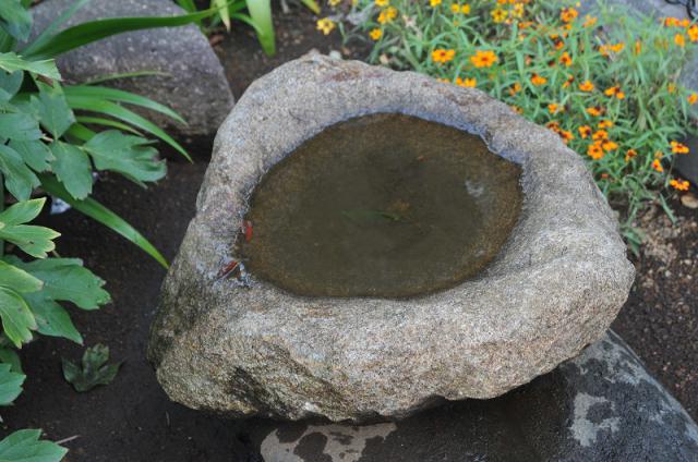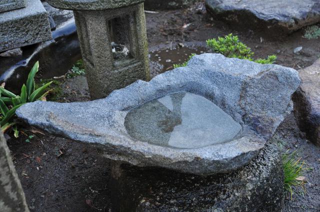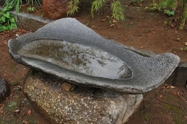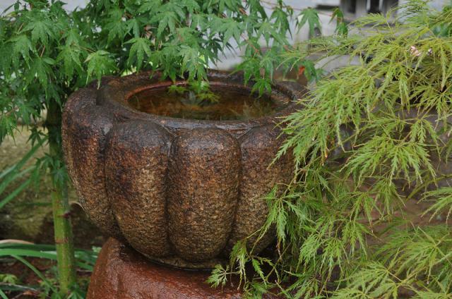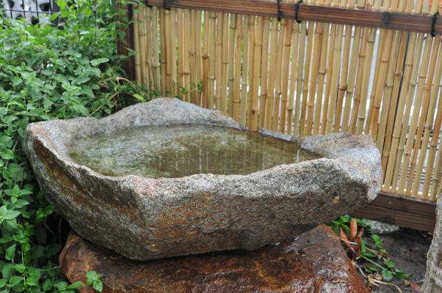 The basin has an oppressive feeling used to wash your hands before entering the tea ceremony room. Today, people love it as just a part of scenery, for example, you can enjoy watching a leaf which is mirrored in the water, you can put the seasons flower on the water, or you can use it as a vase.